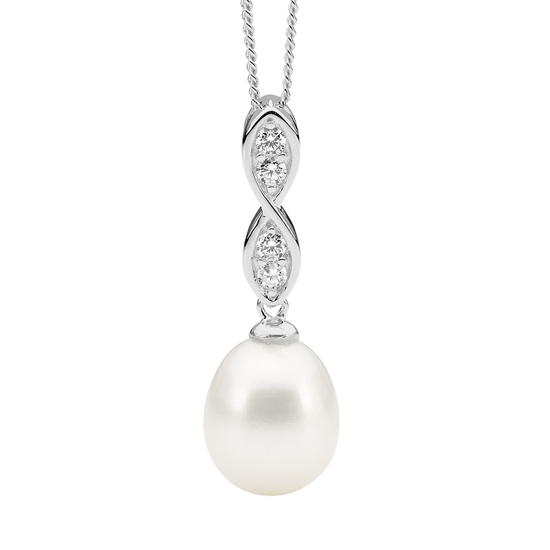 Sterling silver white CZ twist drop pendant with a freshwater pearl.