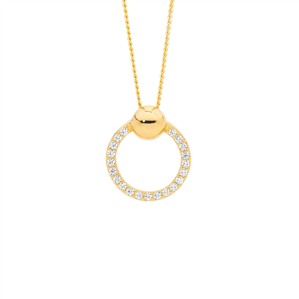 Sterling silver white CZ 13mm open circle pendant with a ball feature and gold plating.