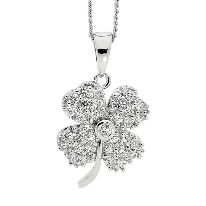 Sterling silver white CZ four leaf clover pendant.