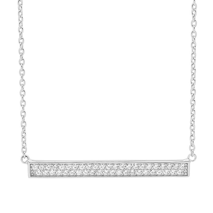 Sterling silver 2 row white CZ bar necklace with double chain and extension chain.