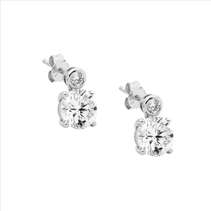 Sterling silver round white CZ bezel and white 8mm round CZ claw set stud drop earrings.