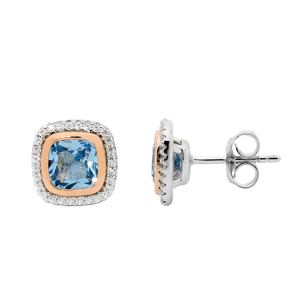 Sterling silver blue spinel cushion cut with rose gold plated bezel and a white CZ Halo Stud Earrings.