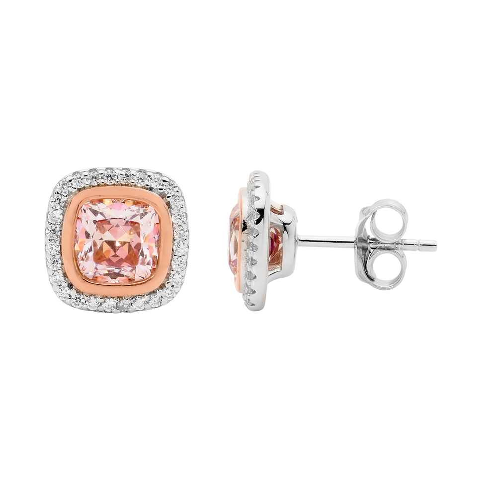 Sterling silver morganite CZ cushion cut with rose gold plated bezel with a white CZ Halo Stud Earrings.
