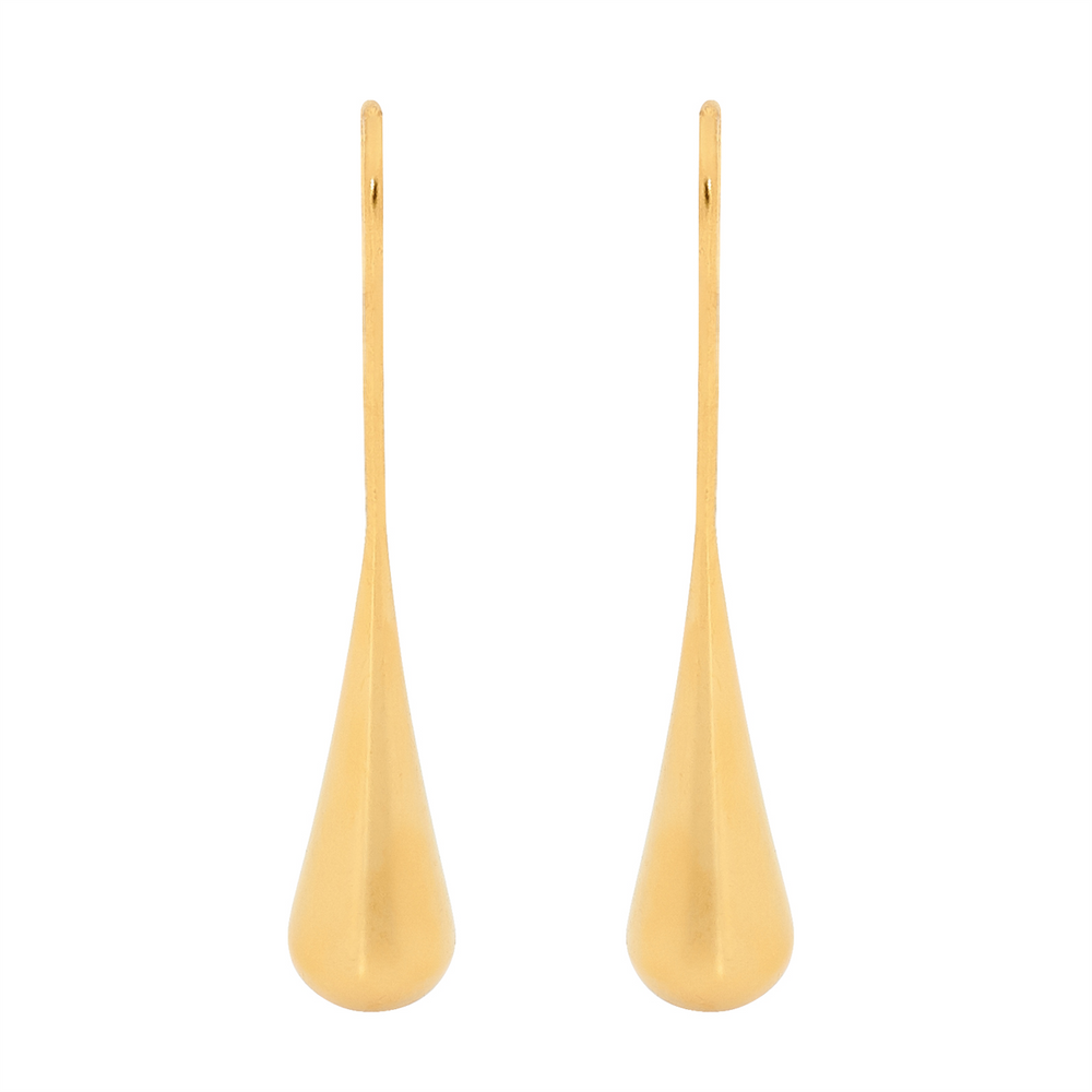 Stainless steel long drop tear earrings with shepherd hooks and gold IP plating.