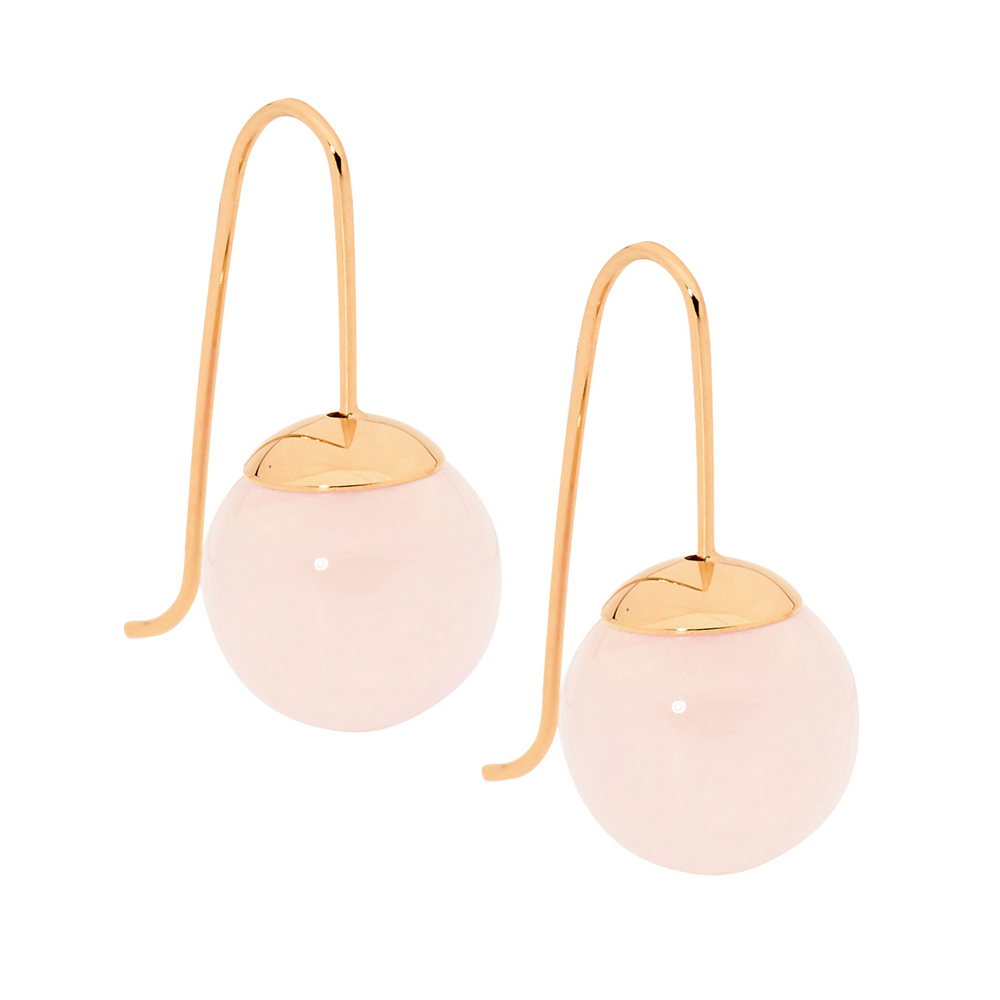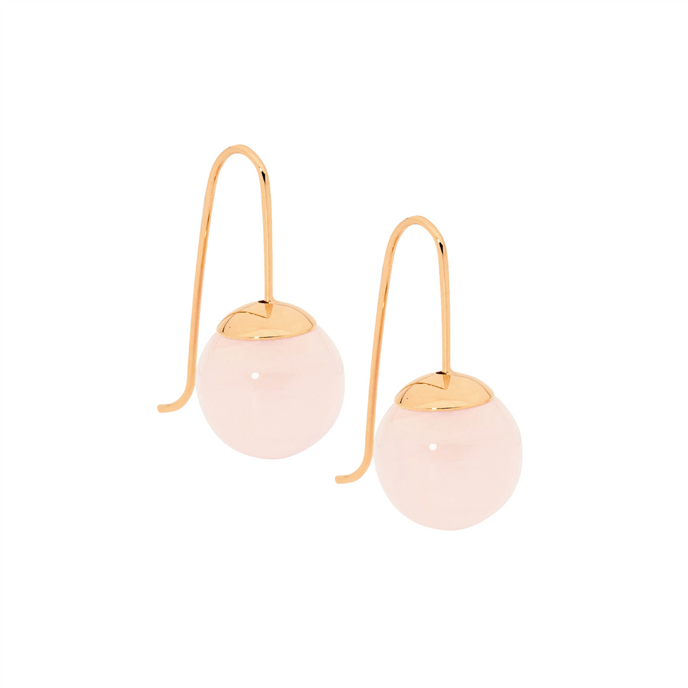 Stainless steel drop earrings with a 12mm rose quartz ball and rose gold IP plating on shepherd hooks.