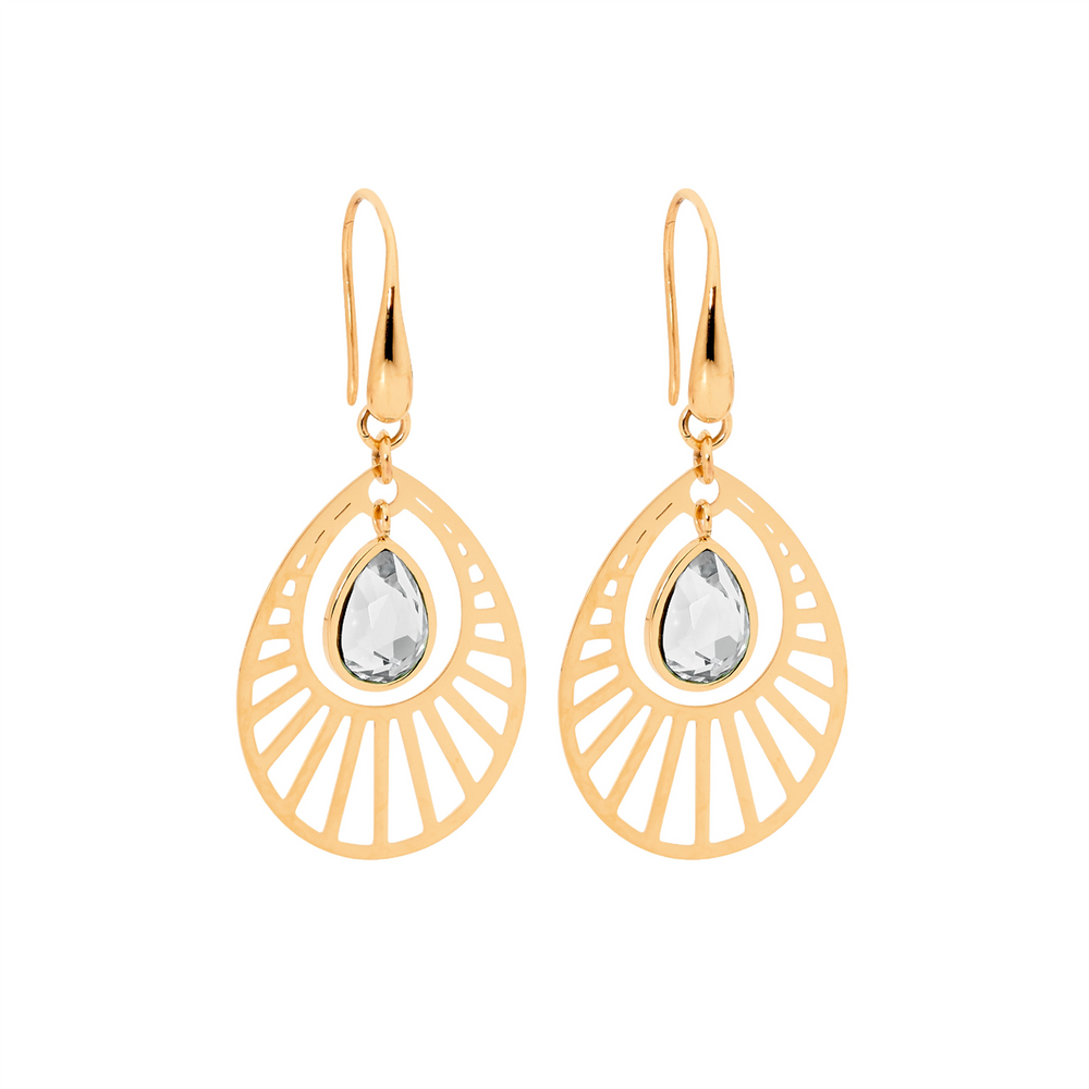 Stainless steel open tear drop earrings with tear white glass and rose gold IP plating on shepherd hooks.