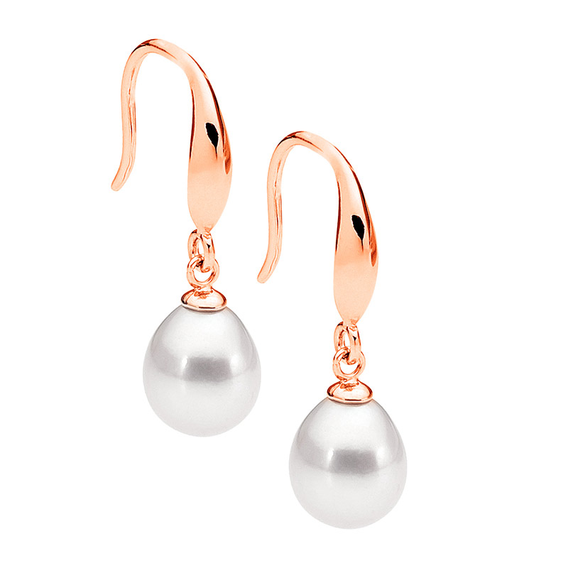 Sterling silver shepherd hook earrings with a freshwater pearl drop and rose gold plating.
