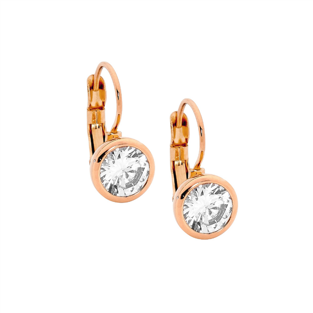 Stainless steel leverback dorp earrings with a 7mm round white CZ bezel and rose gold IP plating.