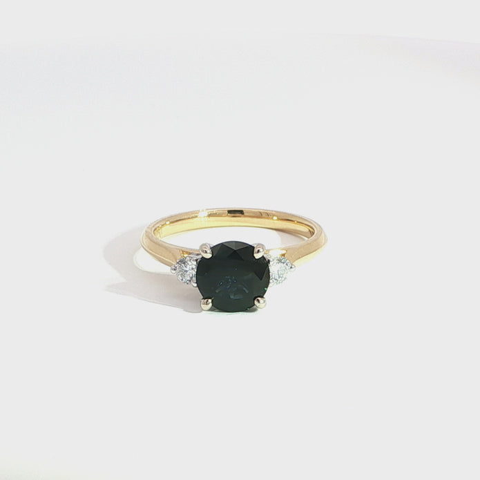 Exquisite multistone ring featuring a forest greenish blue, round-cut natural Sapphire. The brilliant-cut Sapphire offers excellent transparency and is securely set in a lustrous yellow gold band. The composition includes smaller accent stones, arranged to enhance the Sapphire's natural beauty, creating a piece of timeless elegance. Meticulously crafted with high symmetry, polish and gemstone clarity (VS) offers sophisticated flair.