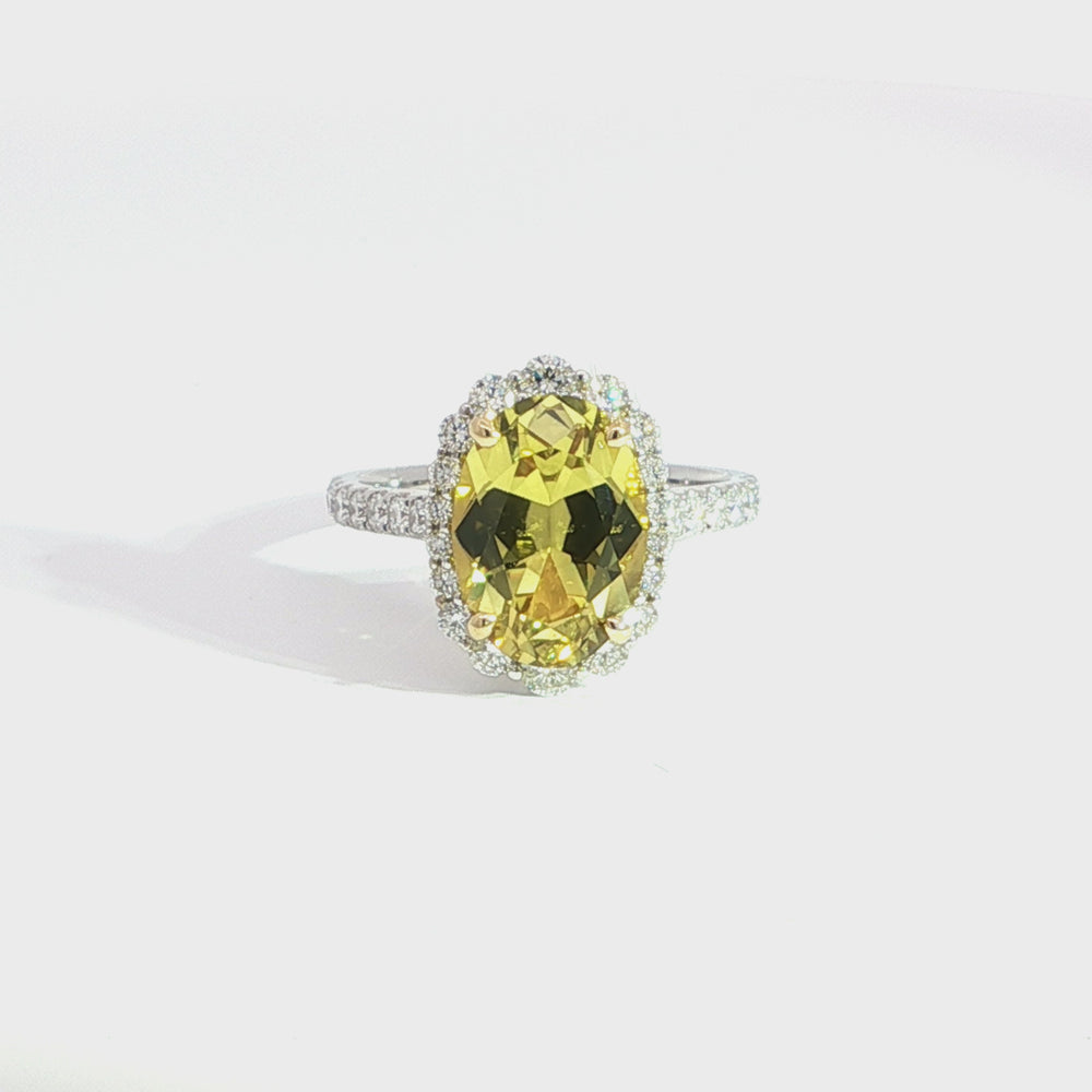 Exquisite ring featuring a central oval shaped Australian Yellow Sapphire, celebrated for its radiant yellow hue. This brilliant cut gemstone is securely mounted in a white and yellow gold setting finished with white gold. The ring showcases exceptional craftsmanship, with meticulous attention to detail in its composition and arrangement of stones, creating a harmonious balance.