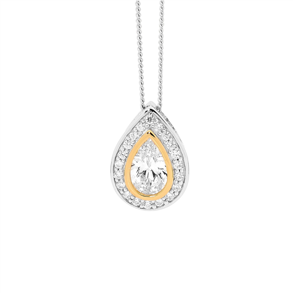 Sterling silver white CZ pear shaped pendant with White CZ's surrounding and gold plating