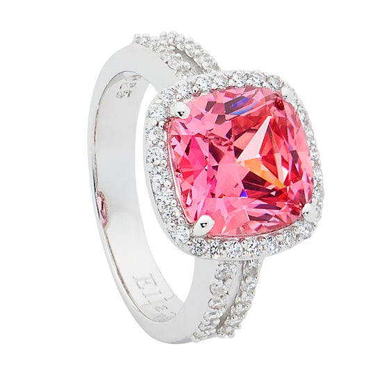 Sterling silver fancy pink cushion cut CZ ring with white CZ's surrounding and on the split band.