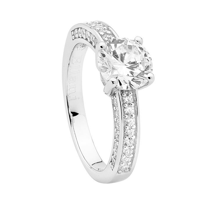 Sterling silver solitaire ring with a white 8mm CZ and white CZ's down the shoulders and on the sides.