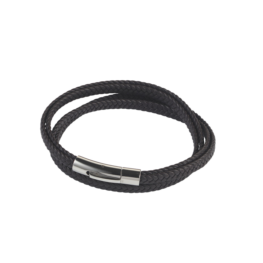 Cudworth Stainless Steel and Black Leather Double Strand Bracelet 40.5cm.