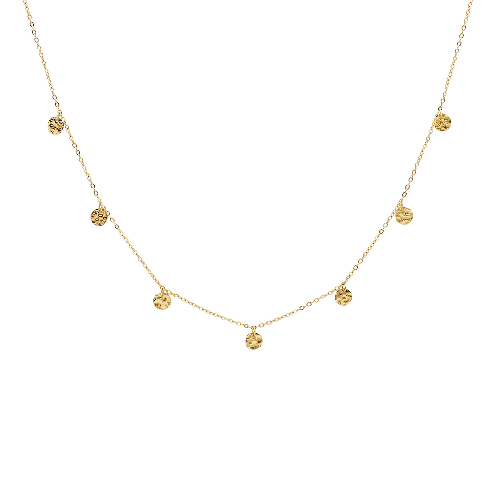 Stainless steel 7x disk feature necklace with 40+5 cm extension and yellow gold IP plating.