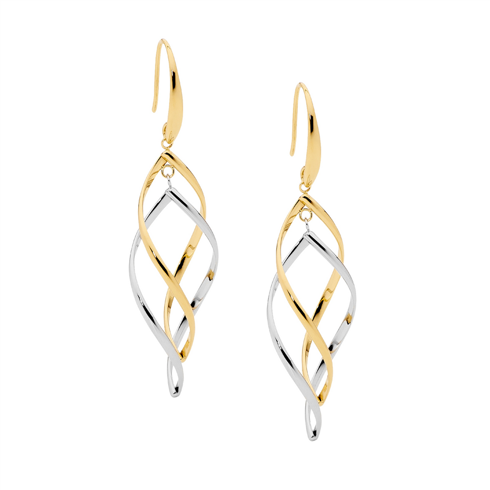 Stainless steel open double twist drop earrings with yellow gold IP plating.