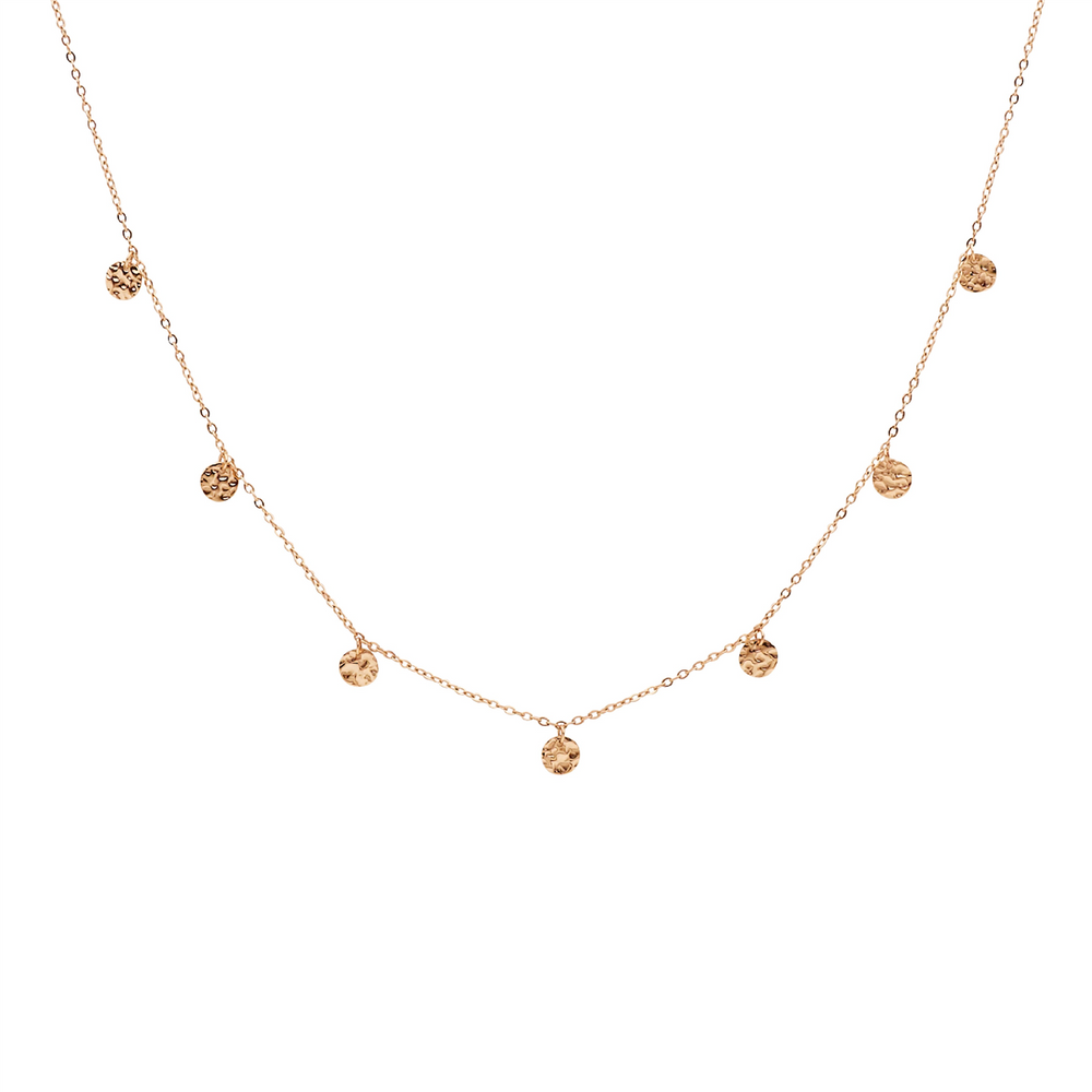 Stainless steel 7x disk feature necklace with 40+5 cm extension and rose gold IP plating.
