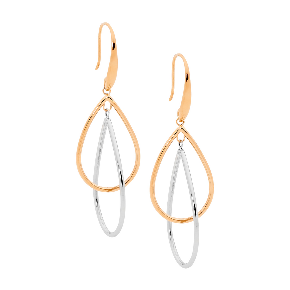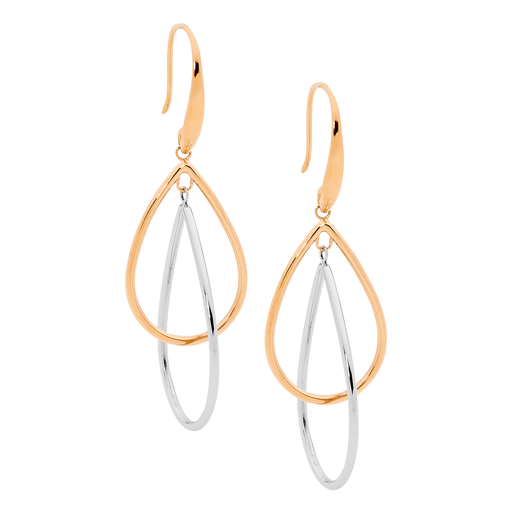 Stainless steel double open tear earrings on shepherd hooks with rose gold IP plating.