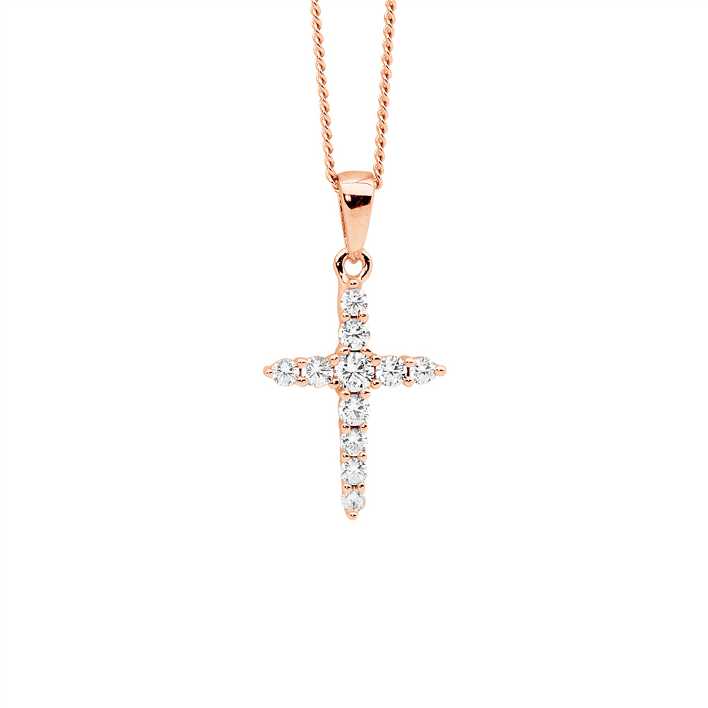 Sterling silver 15mm white CZ cross pendant with rose gold plating.
