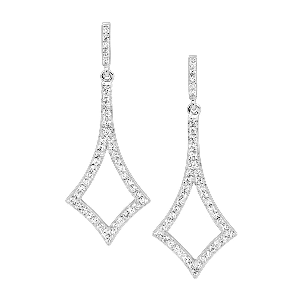 Sterling silver 40mm white CZ open diamond shape drop earrings.