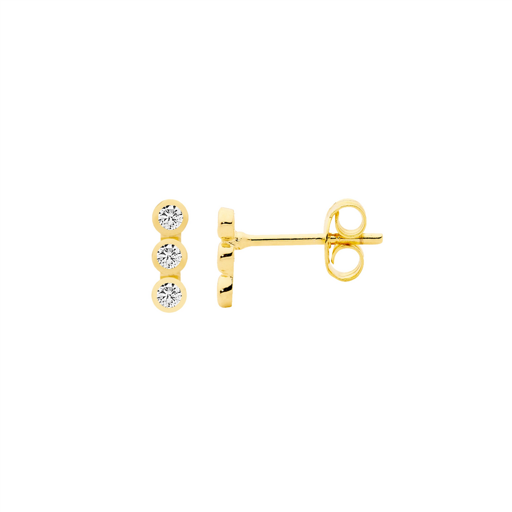 Sterling silver 3x bezel set white CZ stud earrings with yellow gold plating.