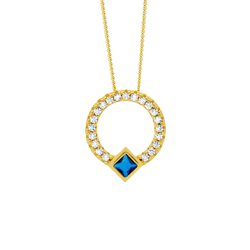 Sterling silver blue and white 13mm open circle pendant with yellow gold plating.