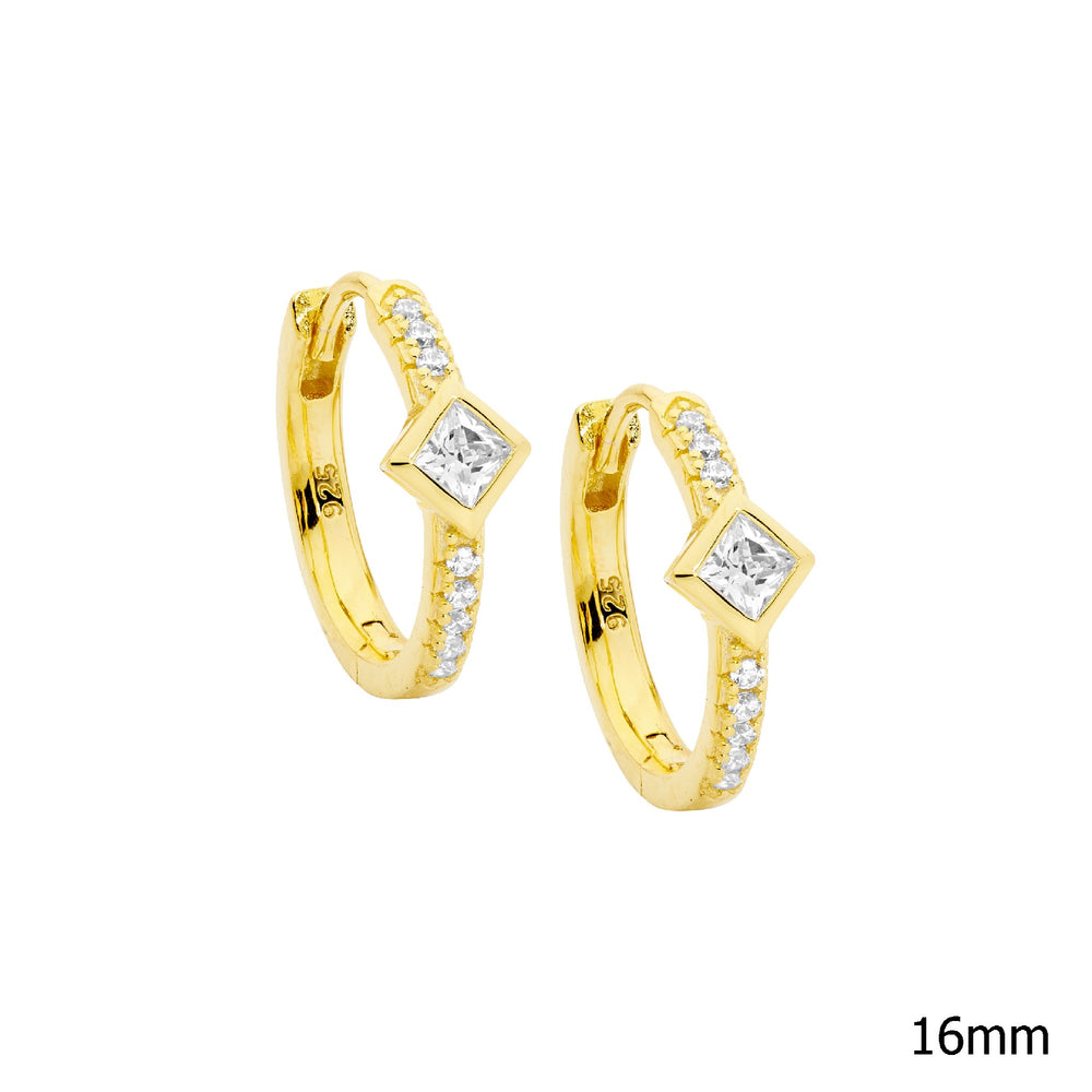 Sterling silver 16mm white CZ huggie earrings with gold plating.