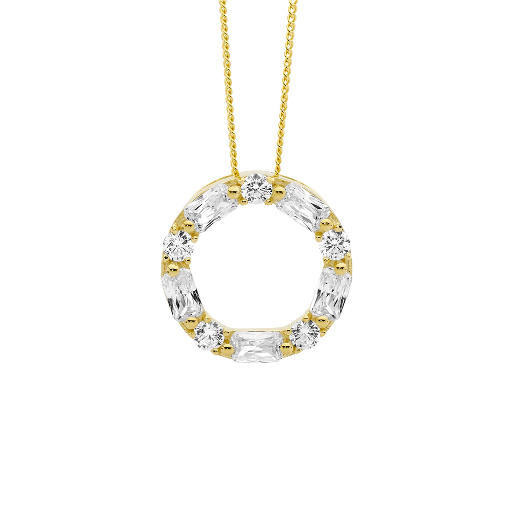 Sterling silver 18mm white round and baguette CZ circle pendant with yellow gold plating.