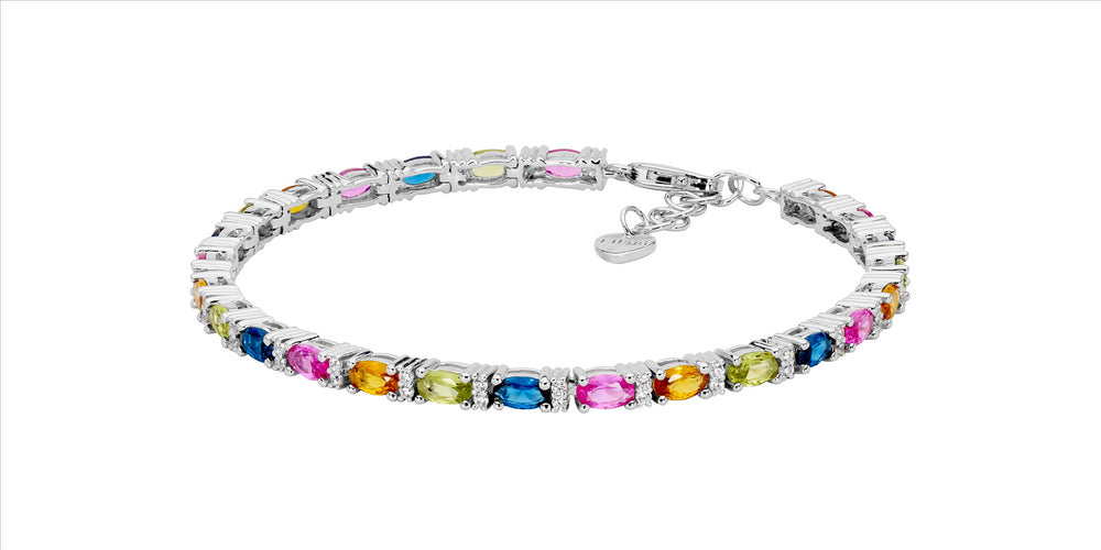 Sterling silver multi coloured oval and white round CZ's tennis bracelet 18cm with a 2cm extension.
