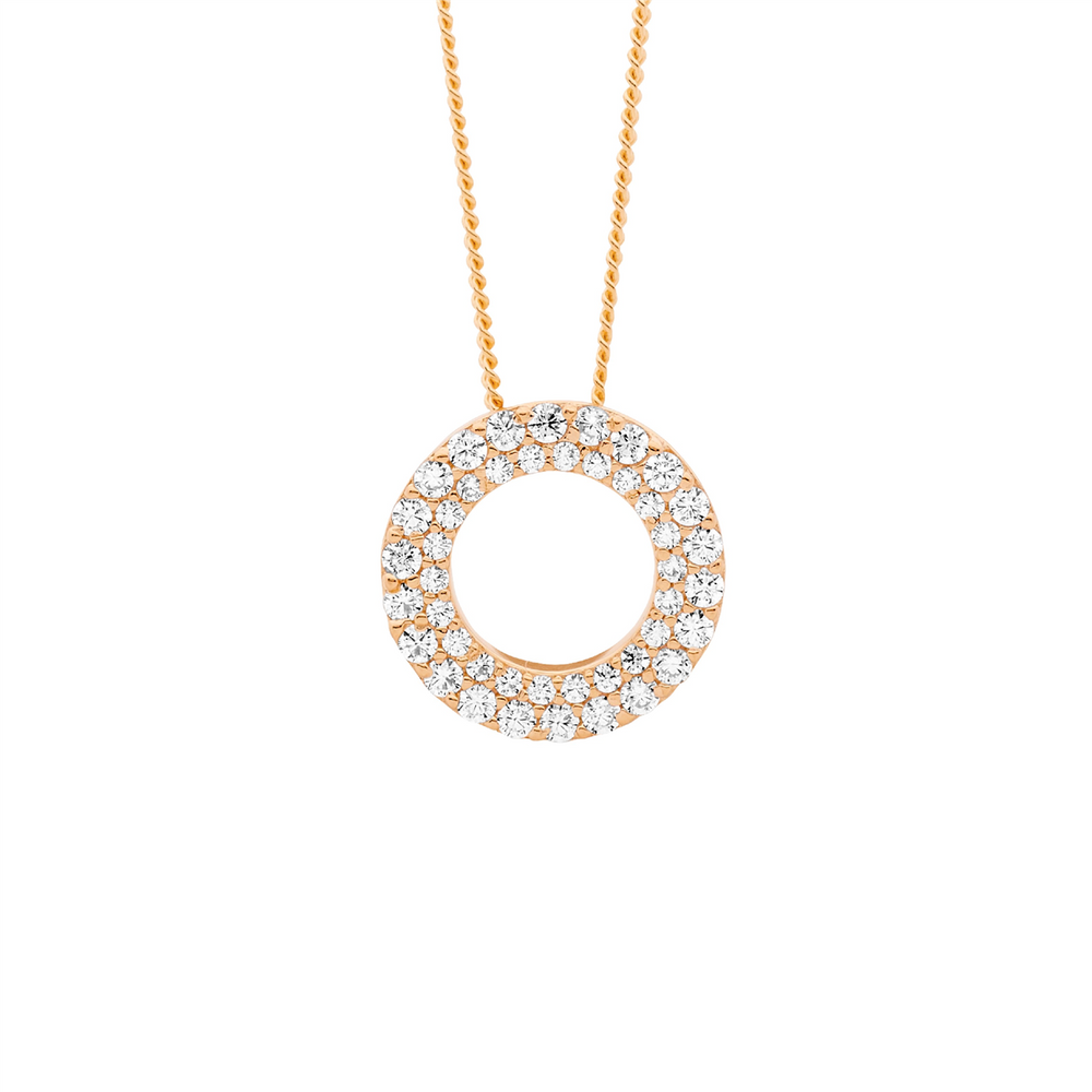 Sterling silver white CZ 13mm double row open circle pendant with rose gold plating.