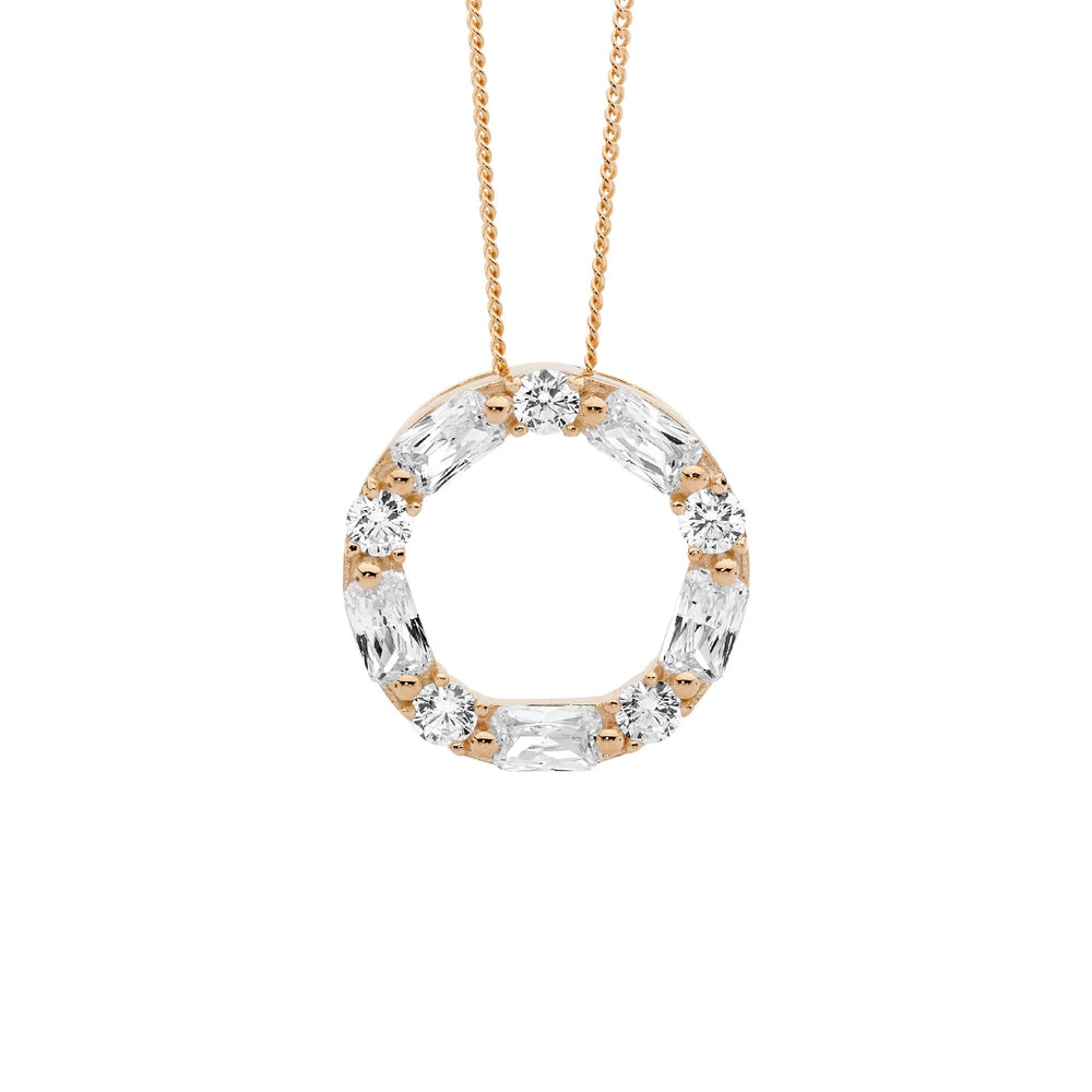 Sterling silver 18mm white round and baguette CZ circle pendant with rose gold plating.