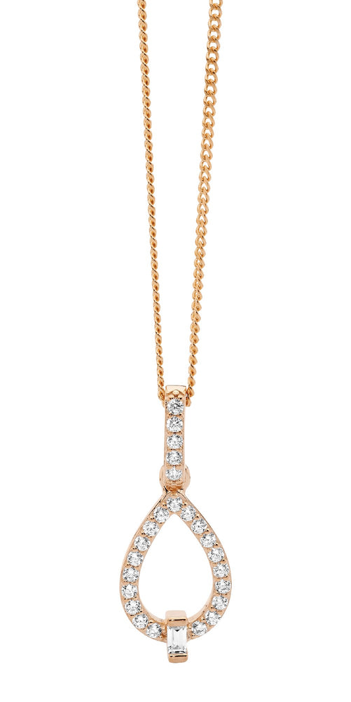 Sterling silver white round and baguette CZ open tear drop pendant with rose gold plating.