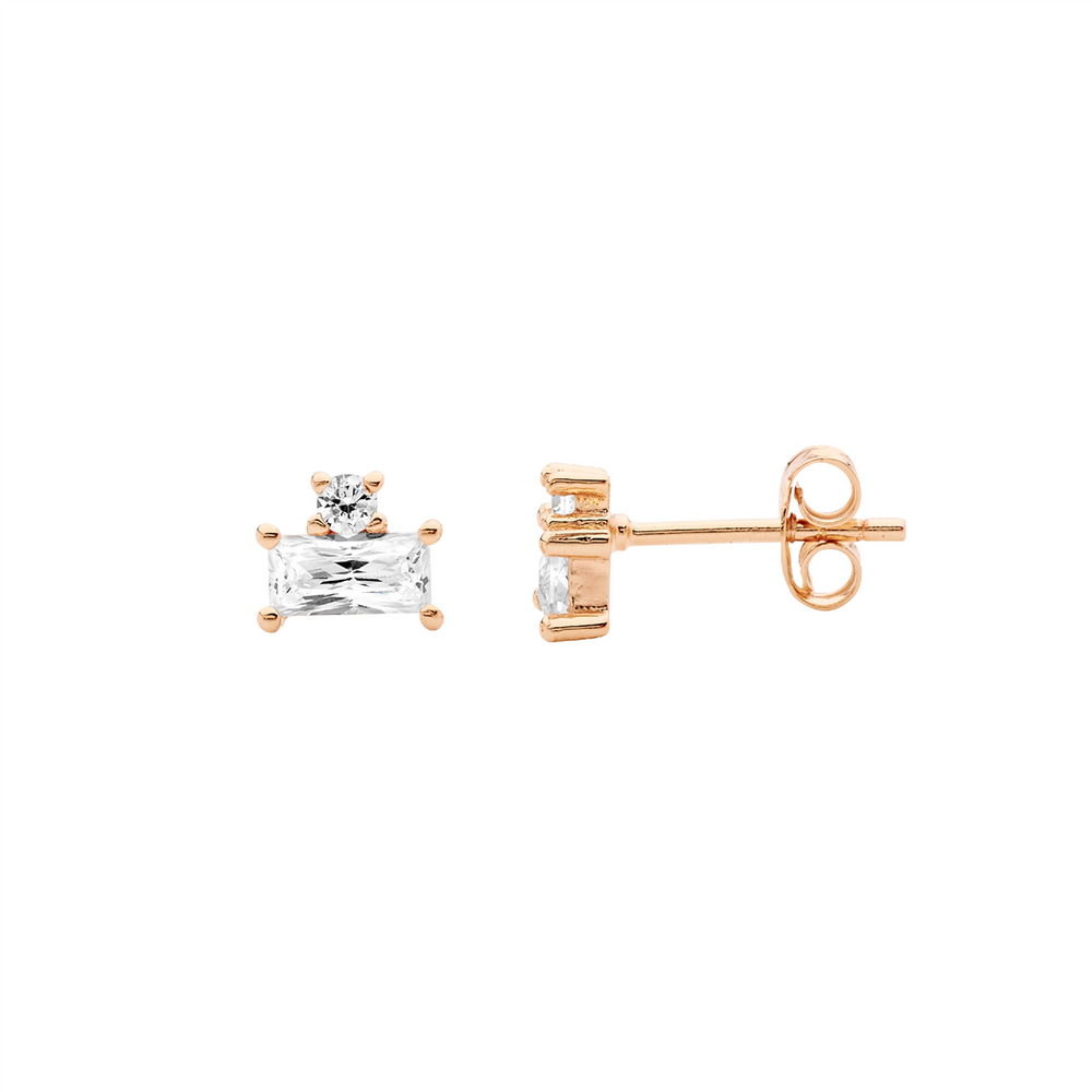 Sterling silver white baguette and round CZ stud earrings with rose gold plating.