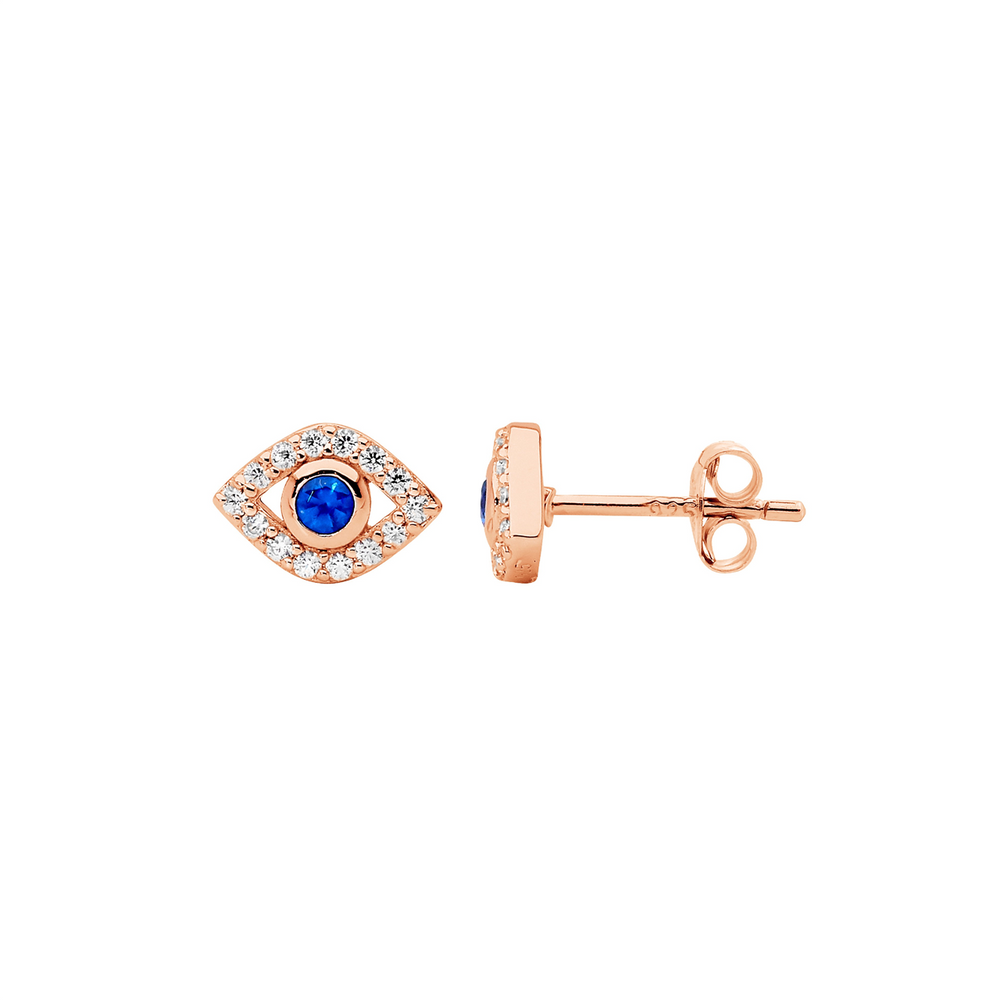 Sterling silver white and blue evil eye stud earrings with rose gold plating.
