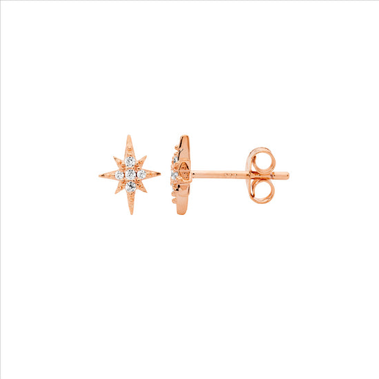 Sterling silver white CZ star stud earrings with rose gold plating.
